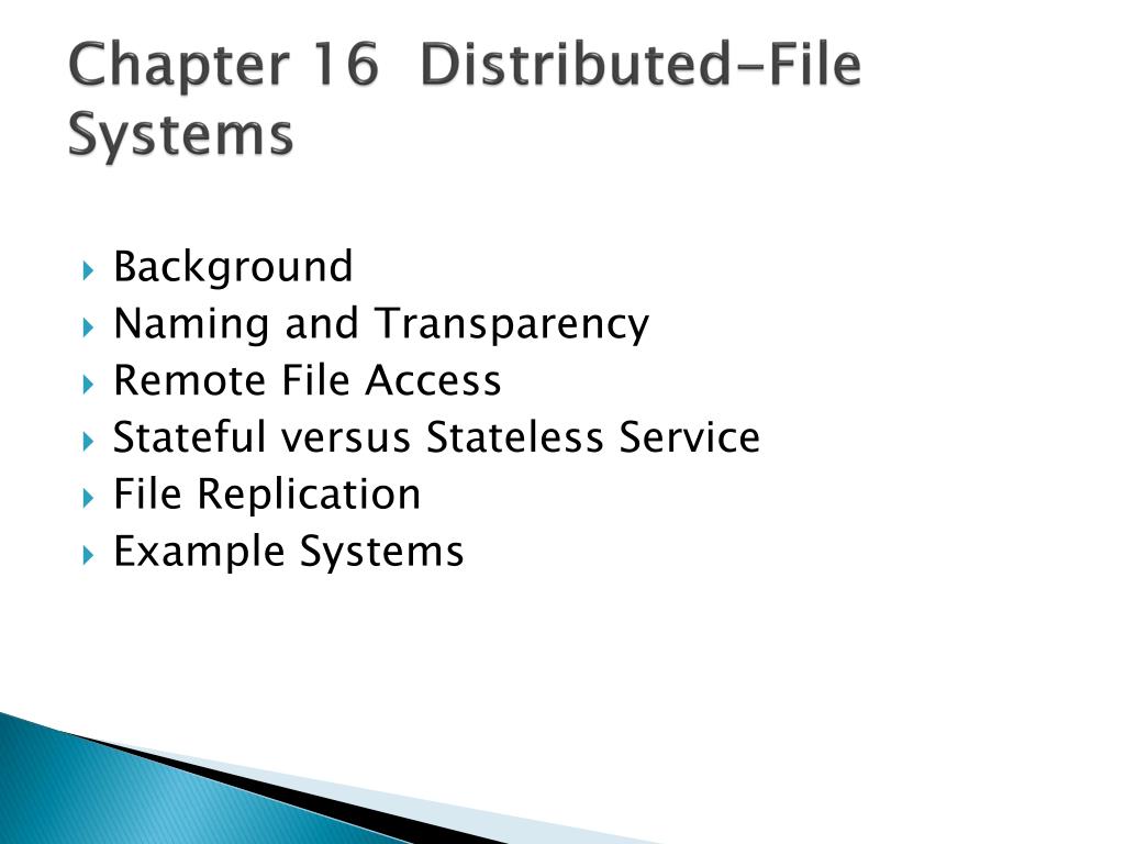 Chapter 16 Distributed-File Systems • Background • Naming and Transparency • Remote File Access • Stateful versus Stateless Service • File Replication • Example Systems