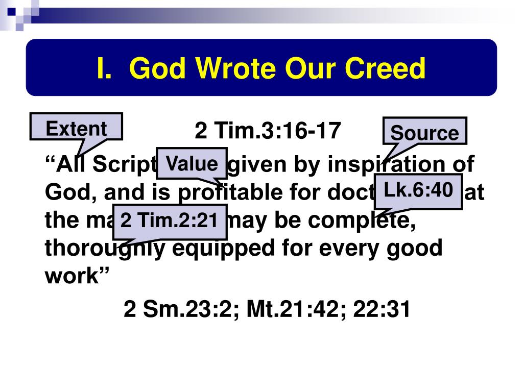 I. God Wrote Our Creed 2 Tim.3:16-17 “All Scripture is given by inspiration of God, and is profitable for doctrine…that the man of God may be complete, thoroughly equipped for every good work” 2 Sm.23:2; Mt.21:42; 22:31 Extent Source Value Lk.6:40 2 Tim.2:21