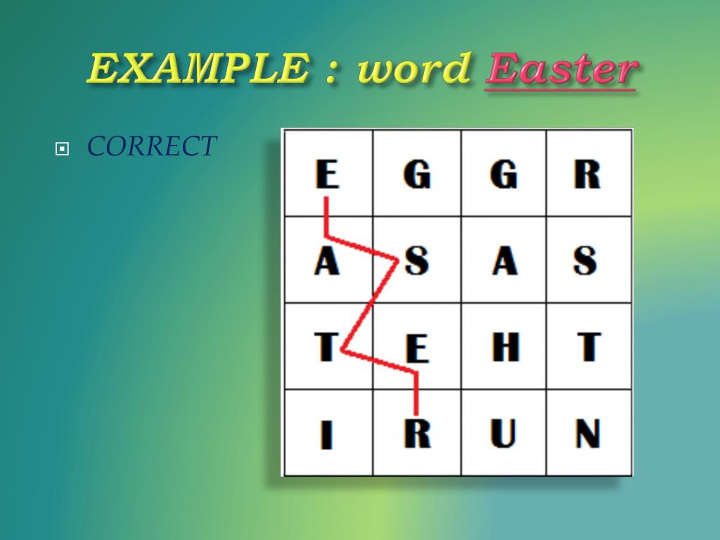 CELEBRATION THURSDAY!. BOGGLE TIME!!. RULES. Look at the boggle letters and try to create as many 3 or more letter words as you can Words can be in any direction, however, each letter must be touching the letter before and after it. . EXAMPLE : word Easter. INCORRECT.