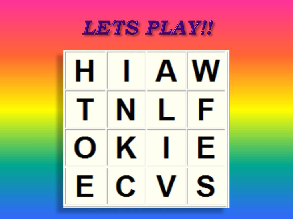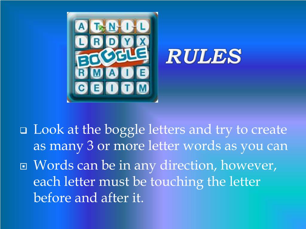 RULES • Look at the boggle letters and try to create as many 3 or more letter words as you can • Words can be in any direction, however, each letter must be touching the letter before and after it.
