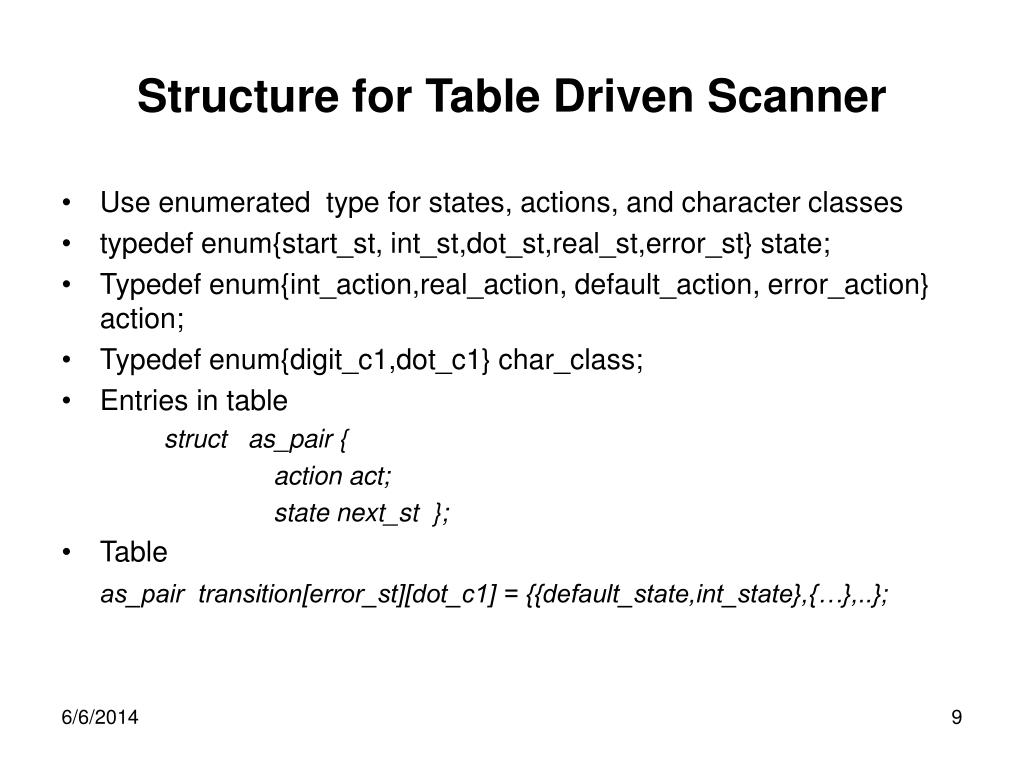 Structure for Table Driven Scanner • Use enumerated type for states, actions, and character classes • typedef enum{start_st, int_st,dot_st,real_st,error_st} state; • Typedef enum{int_action,real_action, default_action, error_action} action; • Typedef enum{digit_c1,dot_c1} char_class; • Entries in table struct as_pair { action act; state next_st }; • Table as_pair transition[error_st][dot_c1] = {{default_state,int_state},{…},..};