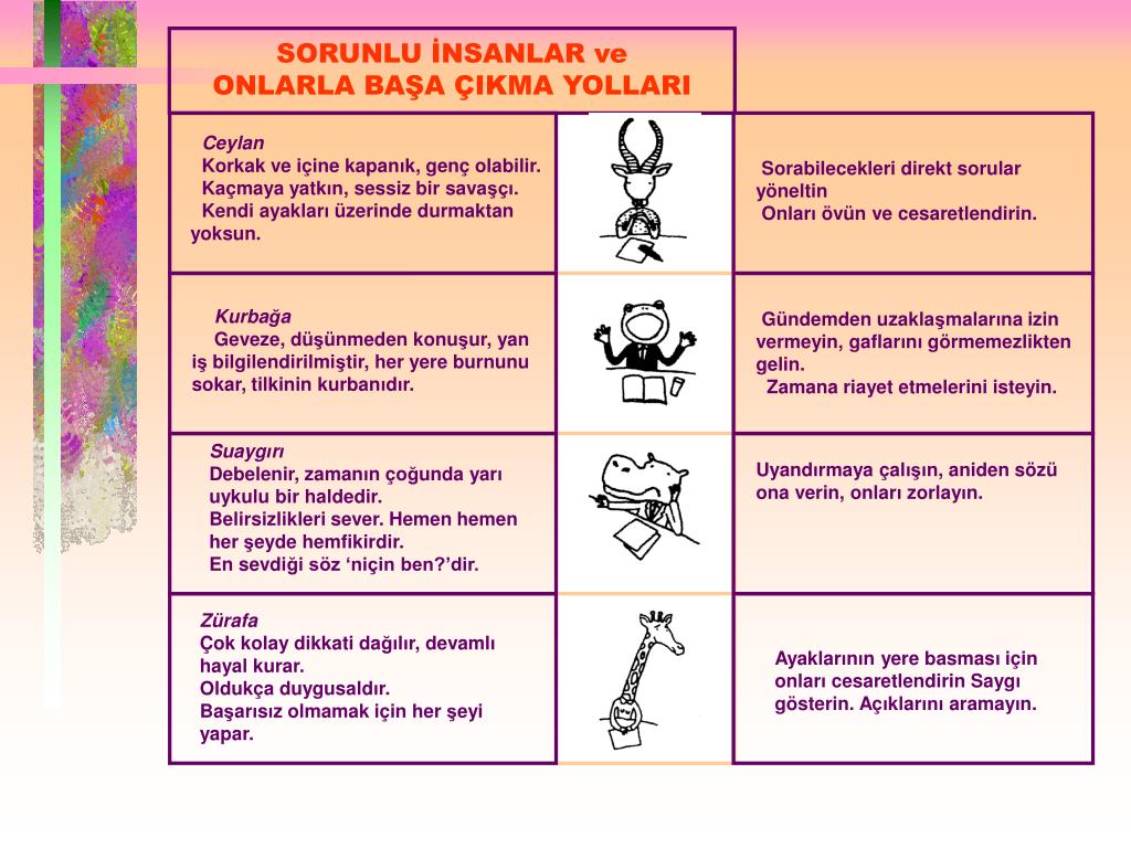 SORUNLU İNSANLAR ve ONLARLA BAŞA ÇIKMA YOLLARI Ceylan Korkak ve içine kapanık, genç olabilir. Kaçmaya yatkın, sessiz bir savaşçı. Kendi ayakları üzerinde durmaktan yoksun. Sorabilecekleri direkt sorular yöneltin Onları övün ve cesaretlendirin. Kurbağa Geveze,düşünmeden konuşur, yan iş bilgilendirilmiştir, her yere burnunu sokar, tilkinin kurbanıdır. Gündemden uzaklaşmalarına izin vermeyin, gaflarını görmemezlikten gelin. Zamana riayet etmelerini isteyin. Suaygırı Debelenir, zamanın çoğunda yarı uykulu bir haldedir. Belirsizlikleri sever. Hemen hemen her şeyde hemfikirdir. En sevdiği söz ‘niçin ben?’dir. Uyandırmaya çalışın, aniden sözü ona verin, onları zorlayın. Zürafa Çok kolay dikkati dağılır, devamlı hayal kurar. Oldukça duygusaldır. Başarısız olmamak için her şeyi yapar. Ayaklarının yere basması için onları cesaretlendirin Saygı gösterin. Açıklarını aramayın.