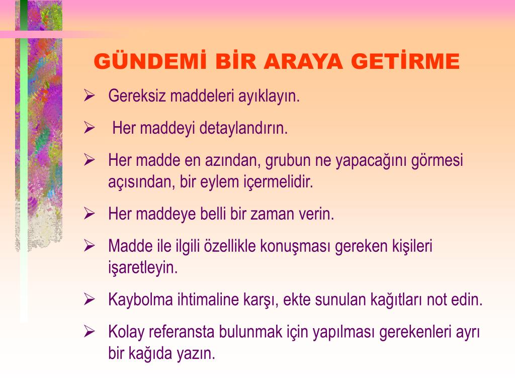 GÜNDEMİ BİR ARAYA GETİRME • Gereksiz maddeleri ayıklayın. • Her maddeyi detaylandırın. • Her madde en azından, grubun ne yapacağını görmesi açısından, bir eylem içermelidir. • Her maddeye belli bir zaman verin. • Madde ile ilgili özellikle konuşması gereken kişileri işaretleyin. • Kaybolma ihtimaline karşı, ekte sunulan kağıtları not edin. • Kolay referansta bulunmak için yapılması gerekenleri ayrı bir kağıda yazın.