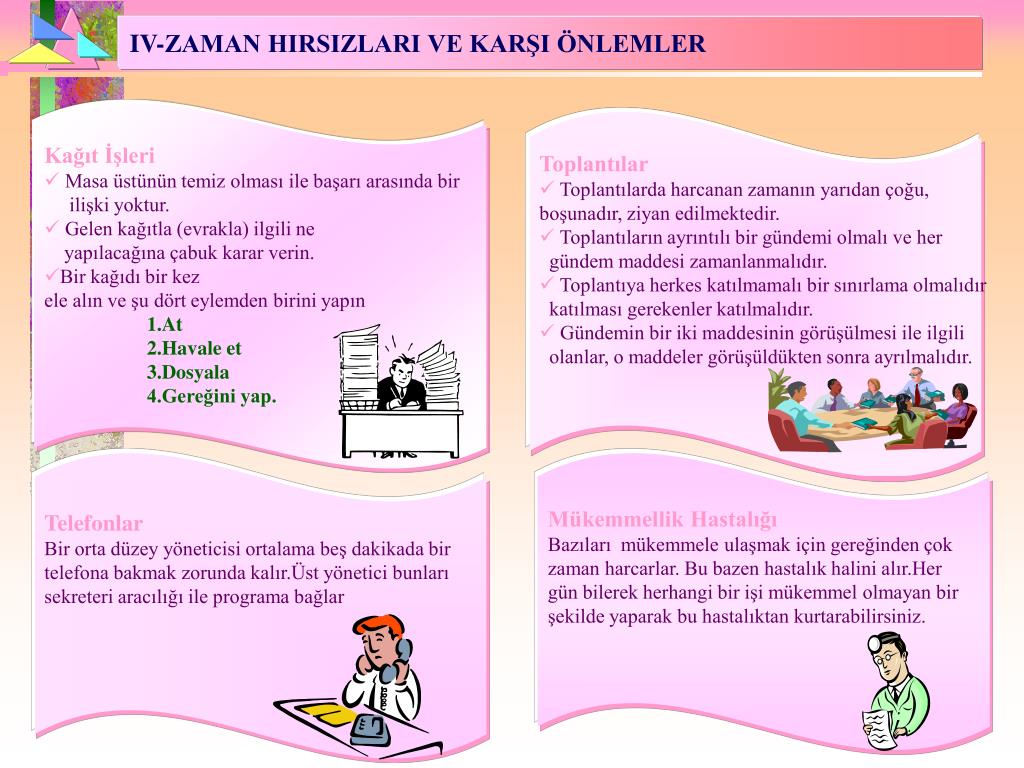 IV-ZAMAN HIRSIZLARI VE KARŞI ÖNLEMLER • Kağıt İşleri • Masa üstünün temiz olması ile başarı arasında bir ilişki yoktur. • Gelen kağıtla (evrakla) ilgili ne yapılacağına çabuk karar verin. • Bir kağıdı bir kez • ele alın ve şu dört eylemden birini yapın • 1.At • 2.Havale et • 3.Dosyala • 4.Gereğini yap. • Toplantılar • Toplantılarda harcanan zamanın yarıdan çoğu, • boşunadır, ziyan edilmektedir. • Toplantıların ayrıntılı bir gündemi olmalı ve her • gündem maddesi zamanlanmalıdır. • Toplantıya herkes katılmamalı bir sınırlama olmalıdır • katılması gerekenler katılmalıdır. • Gündemin bir iki maddesinin görüşülmesi ile ilgili • olanlar, o maddeler görüşüldükten sonra ayrılmalıdır. Telefonlar Bir orta düzey yöneticisi ortalama beş dakikada bir telefona bakmak zorunda kalır.Üst yönetici bunları sekreteri aracılığı ile programa bağlar Mükemmellik Hastalığı Bazıları mükemmele ulaşmak için gereğinden çok zaman harcarlar. Bu bazen hastalık halini alır.Her gün bilerek herhangi bir işi mükemmel olmayan bir şekilde yaparak bu hastalıktan kurtarabilirsiniz.