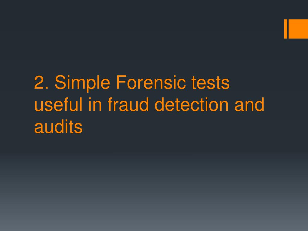 Agenda 1. Forensic Accounting and it's meaning and relevance 2. Some simple forensic tests which can be conveniently used in audits 3. Case studies on fraud detection and use of forensic accounting techniques 4. Opportunities for CAs in this field in the foreseeable future