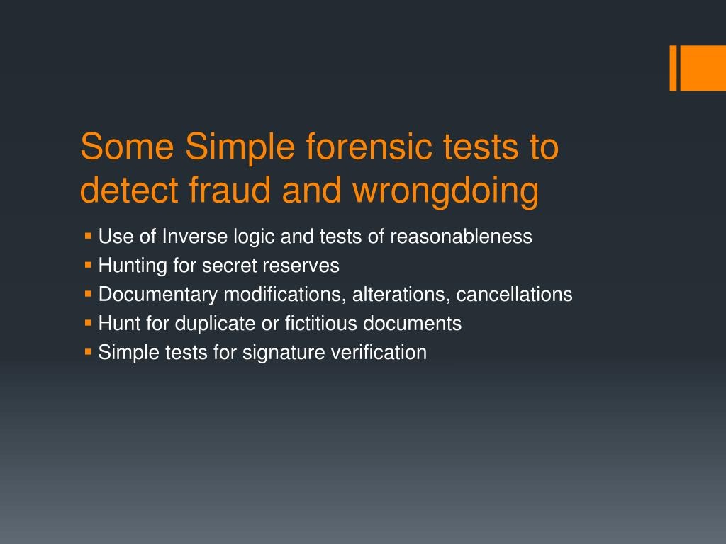 Some Simple forensic tests to detect fraud and wrongdoing • Use of Inverse logic and tests of reasonableness • Hunting for secret reserves • Documentary modifications, alterations, cancellations • Hunt for duplicate or fictitious documents • Simple tests for signature verification