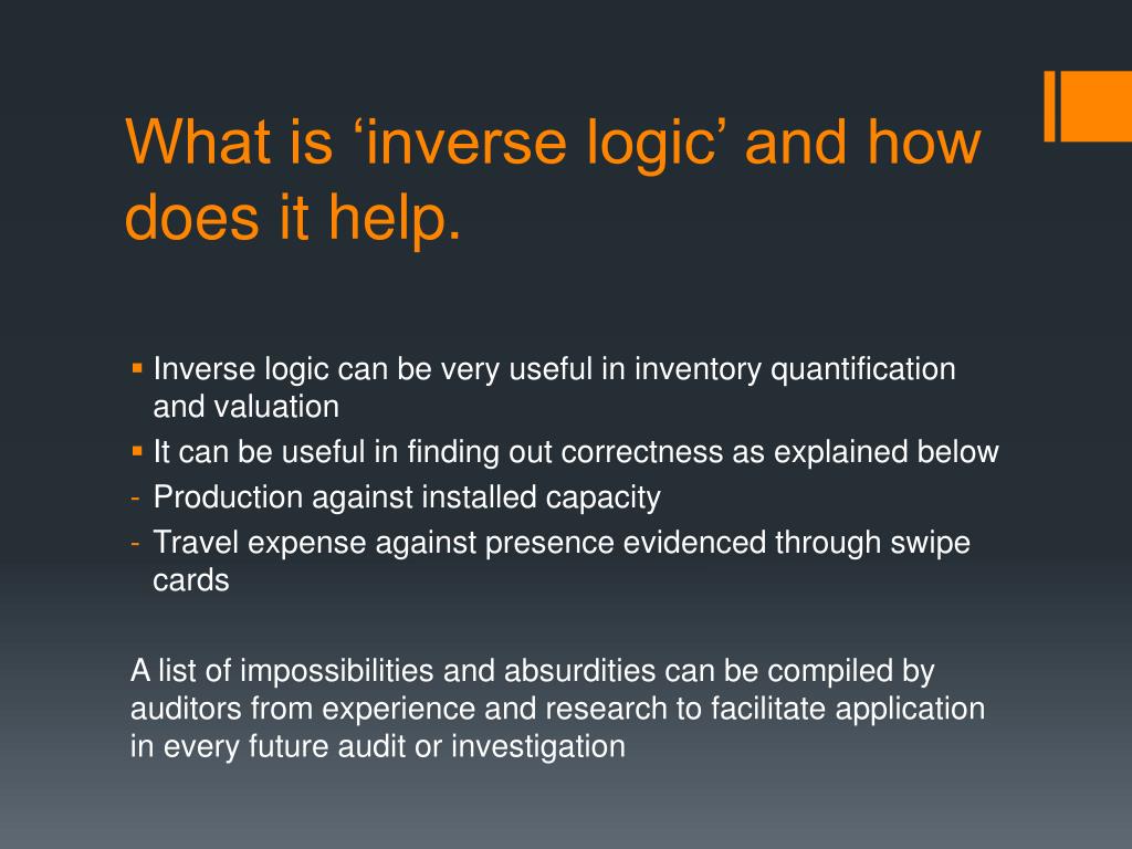 What is ‘inverse logic’ and how does it help. • Inverse logic can be very useful in inventory quantification and valuation • It can be useful in finding out correctness as explained below • Production against installed capacity • Travel expense against presence evidenced through swipe cards A list of impossibilities and absurdities can be compiled by auditors from experience and research to facilitate application in every future audit or investigation