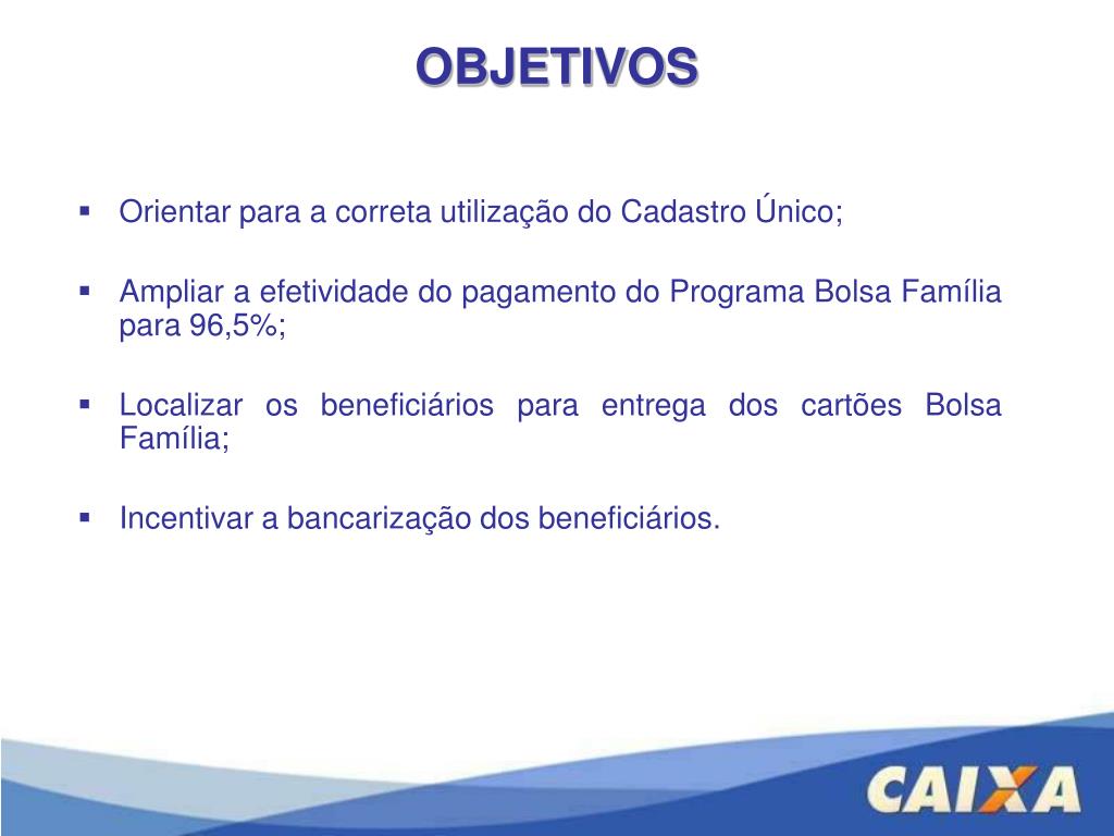 OBJETIVOS Orientar para a correta utilização do Cadastro Único; Ampliar a efetividade do pagamento do Programa Bolsa Família para 96,5%; Localizar os beneficiários para entrega dos cartões Bolsa Família; Incentivar a bancarização dos beneficiários.