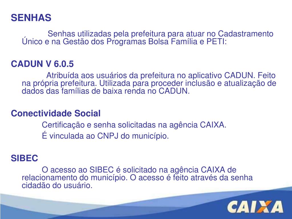 SENHAS • Senhas utilizadas pela prefeitura para atuar no Cadastramento Único e na Gestão dos Programas Bolsa Família e PETI: • CADUN V 6.0.5 • Atribuída aos usuários da prefeitura no aplicativo CADUN. Feito na própria prefeitura. Utilizada para proceder inclusão e atualização de dados das famílias de baixa renda no CADUN. • Conectividade Social • Certificação e senha solicitadas na agência CAIXA. • É vinculada ao CNPJ do município. • SIBEC • O acesso ao SIBEC é solicitado na agência CAIXA de relacionamento do município. O acesso é feito através da senha cidadão do usuário.