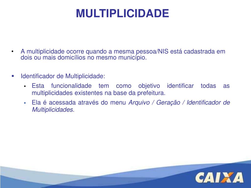 MULTIPLICIDADE • A multiplicidade ocorre quando a mesma pessoa/NIS está cadastrada em dois ou mais domicílios no mesmo município. • Identificador de Multiplicidade: • Esta funcionalidade tem como objetivo identificar todas as multiplicidades existentes na base da prefeitura. • Ela é acessada através do menu Arquivo / Geração / Identificador de Multiplicidades.