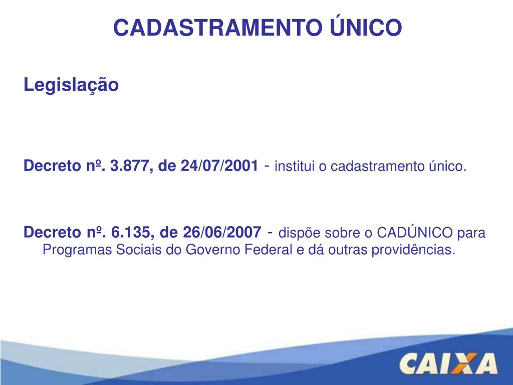 CADASTRAMENTO ÚNICO • Legislação • Decreto nº. 3.877, de 24/07/2001- institui o cadastramento único. • Decreto nº. 6.135, de 26/06/2007- dispõe sobre o CADÚNICO para Programas Sociais do Governo Federal e dá outras providências.