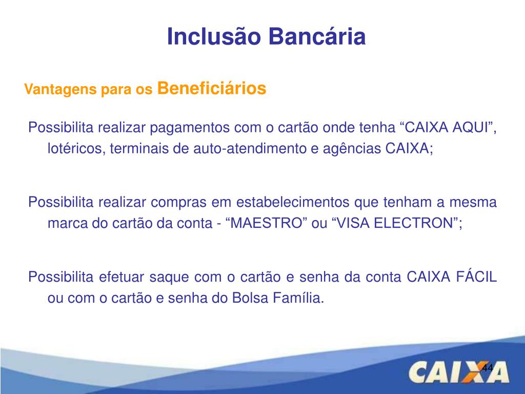 Comodidade e segurança, pois o beneficiário pode sacar somente os valores que precisar (débito parcial); Isenção de tarifas para compras com cartão, consulta de saldo, depósitos e manutenção da conta; Isenção de tarifa para até 4 saques mensais e 1 extrato semanal; Acesso à conta pela internet; Inclusão Bancária Vantagens para os Beneficiários: 43