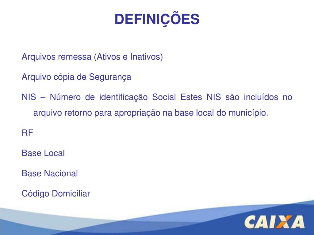 DEFINIÇÕES • Arquivos remessa (Ativos e Inativos) • Arquivo cópia de Segurança • NIS – Número de identificação Social Estes NIS são incluídos no arquivo retorno para apropriação na base local do município. • RF • Base Local • Base Nacional • Código Domiciliar