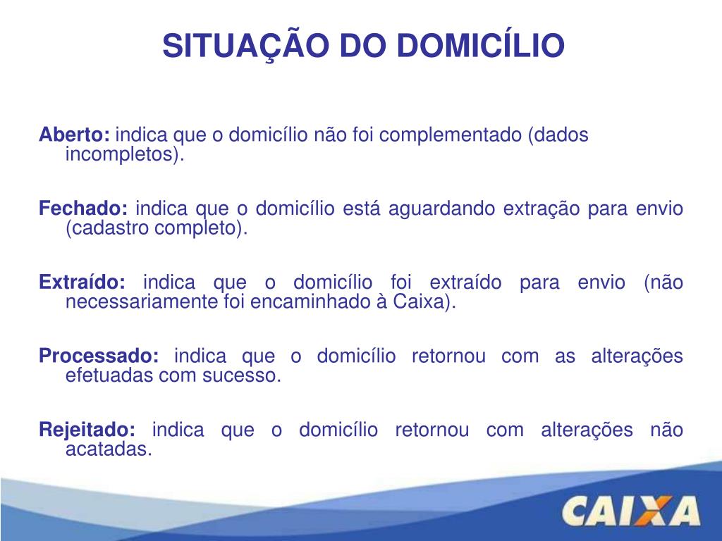 SITUAÇÃO DO DOMICÍLIO Aberto: indica que o domicílio não foi complementado (dados incompletos). • Fechado: indica que o domicílio está aguardando extração para envio (cadastro completo). • Extraído: indica que o domicílio foi extraído para envio (não necessariamente foi encaminhado à Caixa). • Processado: indica que o domicílio retornou com as alterações efetuadas com sucesso. • Rejeitado: indica que o domicílio retornou com alterações não acatadas.