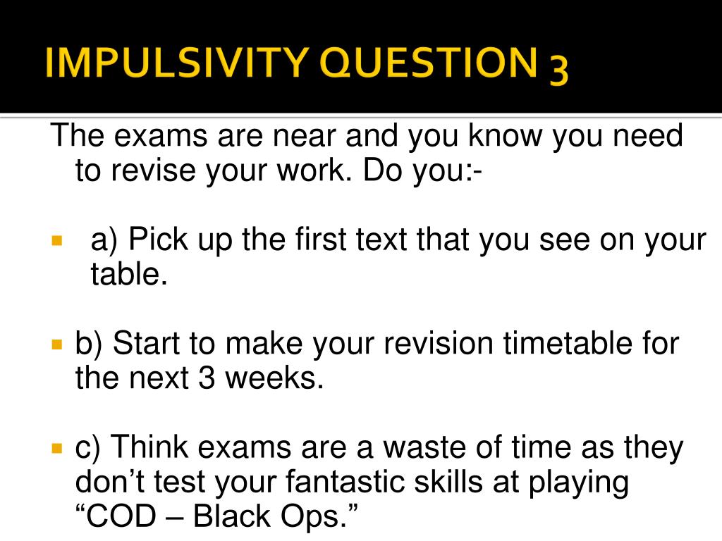 IMPULSIVITY QUESTION 3 The exams are near and you know you need to revise your work. Do you:- • a) Pick up the first text that you see on your table. • b) Start to make your revision timetable for the next 3 weeks. • c) Think exams are a waste of time as they don’t test your fantastic skills at playing “COD – Black Ops.”