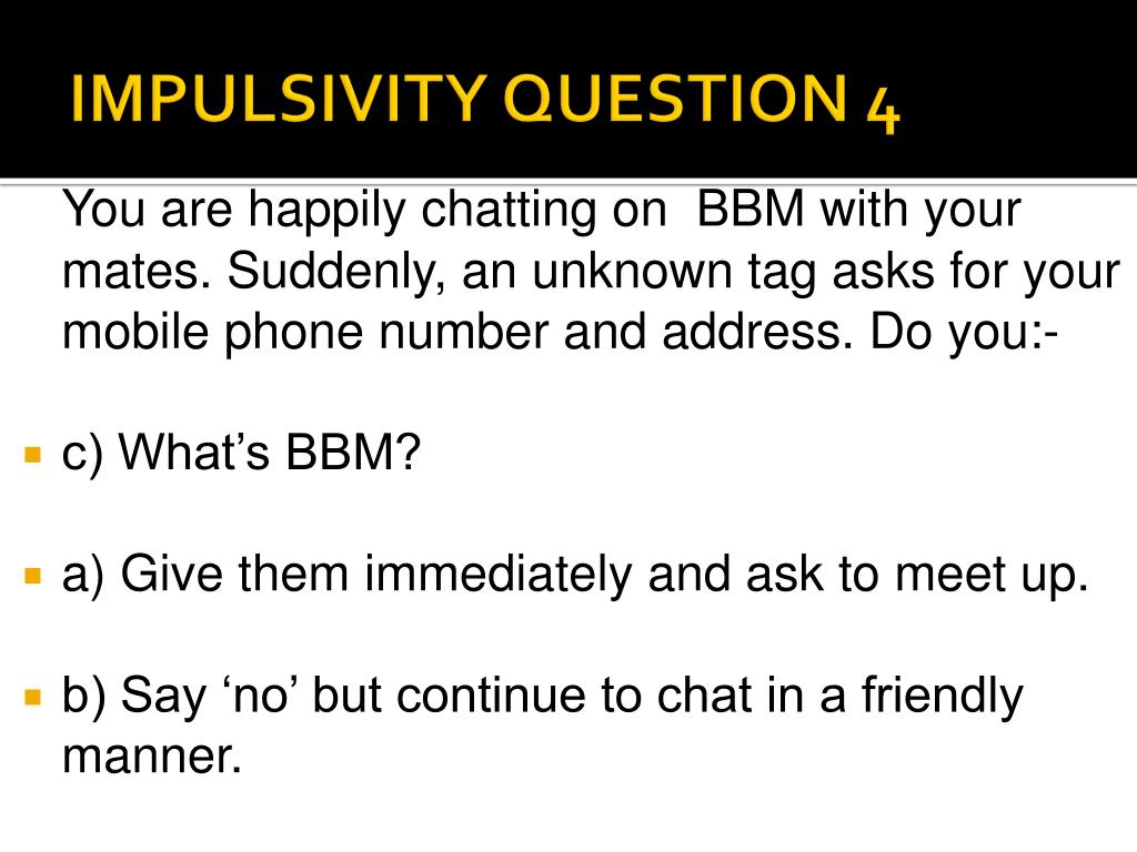 IMPULSIVITY QUESTION 4 You are happily chatting on BBM with your mates. Suddenly, an unknown tag asks for your mobile phone number and address. Do you:- • c) What’s BBM? • a) Give them immediately and ask to meet up. • b) Say ‘no’ but continue to chat in a friendly manner.