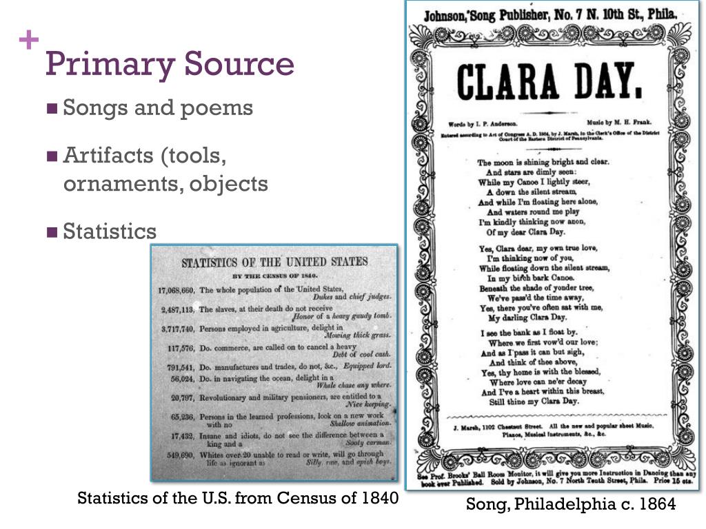 Primary Source • Songs and poems • Artifacts (tools, ornaments, objects • Statistics Statistics of the U.S. from Census of 1840 Song, Philadelphia c. 1864