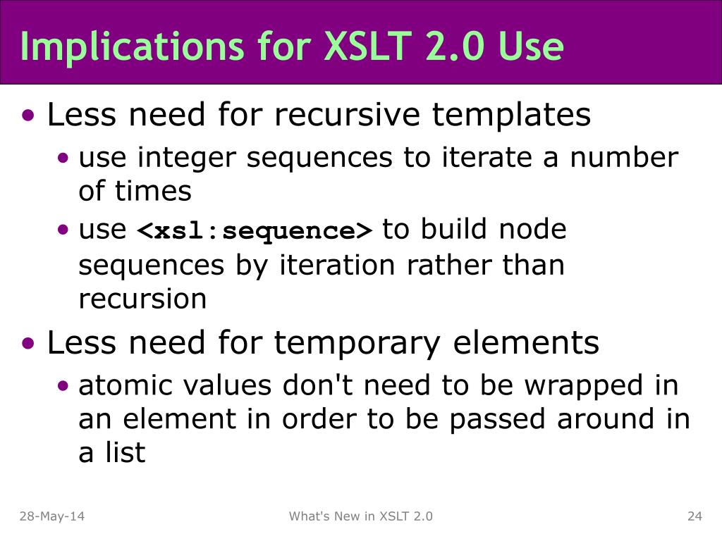 Implications for XSLT 2.0 Use • Less need for recursive templates • use integer sequences to iterate a number of times • use <xsl:sequence> to build node sequences by iteration rather than recursion • Less need for temporary elements • atomic values don't need to be wrapped in an element in order to be passed around in a list What's New in XSLT 2.0