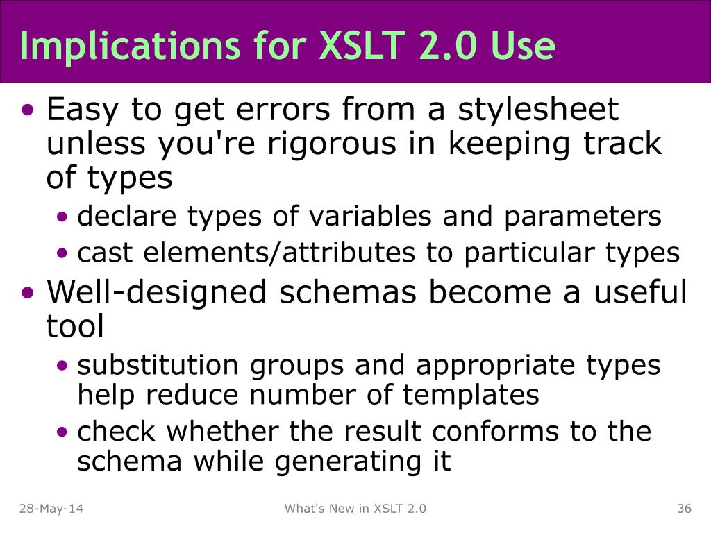 Implications for XSLT 2.0 Use • Easy to get errors from a stylesheet unless you're rigorous in keeping track of types • declare types of variables and parameters • cast elements/attributes to particular types • Well-designed schemas become a useful tool • substitution groups and appropriate types help reduce number of templates • check whether the result conforms to the schema while generating it What's New in XSLT 2.0