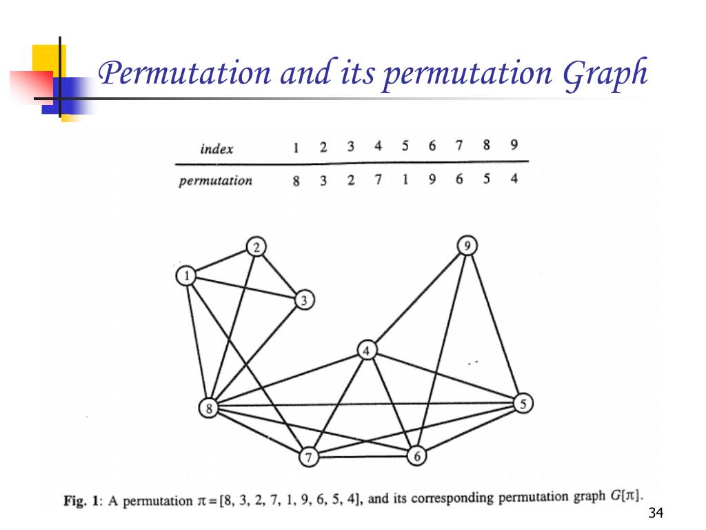 Permutation Graphs • Let πbe a permutation on Nn= {1, 2,…, n} • Let us think of πas a sequence [π1, π2,…,πn]so, for example, the permutation π=[4,3,6,1,5,2] has π1= 4, π2 = 3, etc.