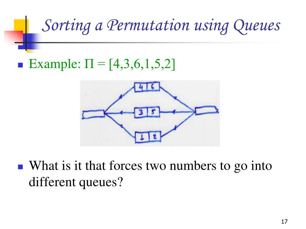 Sorting a Permutation using Queues • Let us consider the problem of sorting a permutation πof {1, 2, …., n} using a network of K queues arranged in parallel. • Given a permutation π; how many queues will we need?