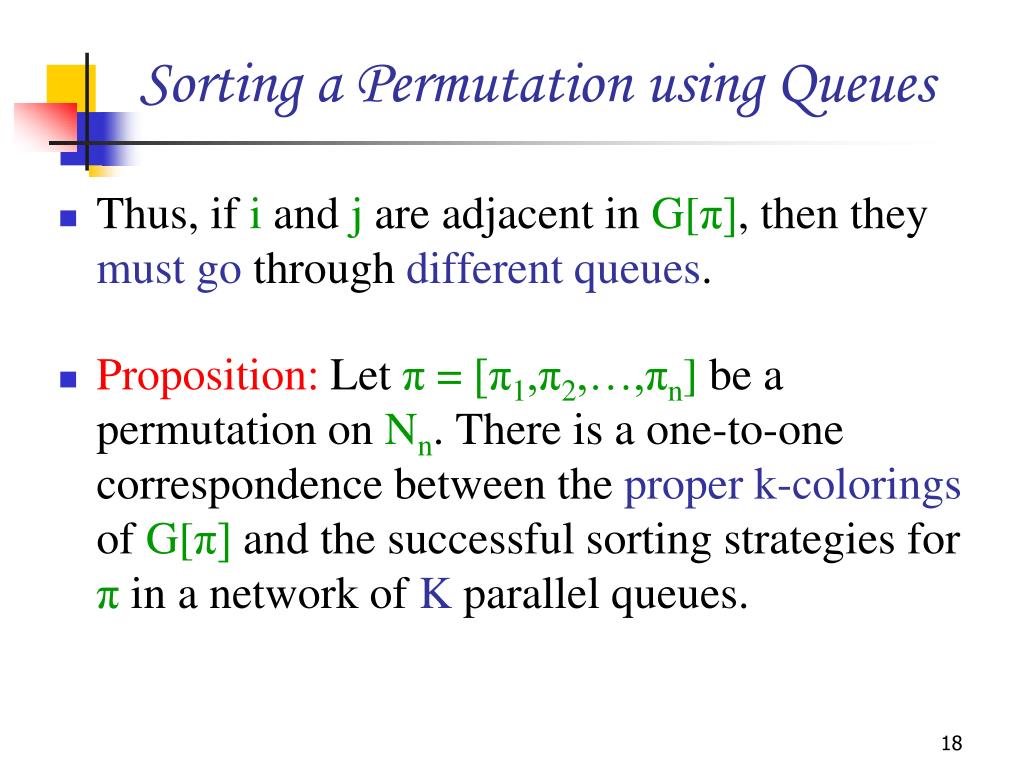 Sorting a Permutation using Queues • Thus, if i and j are adjacent in G[π], then they must go through different queues. • Proposition: Let π=[π1,π2,…,πn] be a permutation on Nn. There is a one-to-one correspondence between the proper k-colorings of G[π] and the successful sorting strategies for πin a network of K parallel queues.