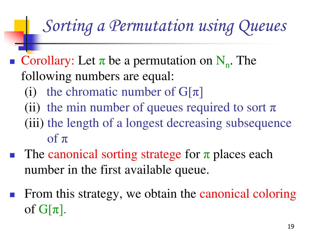Sorting a Permutation using Queues • Corollary: Let πbe a permutation on Nn. The following numbers are equal: (i) the chromatic number of G[π] (ii) the min number of queues required to sort π (iii) the length of a longest decreasing subsequence of π • The canonical sorting stratege for πplaces each number in the first available queue. • From this strategy, we obtain the canonical coloring of G[π].