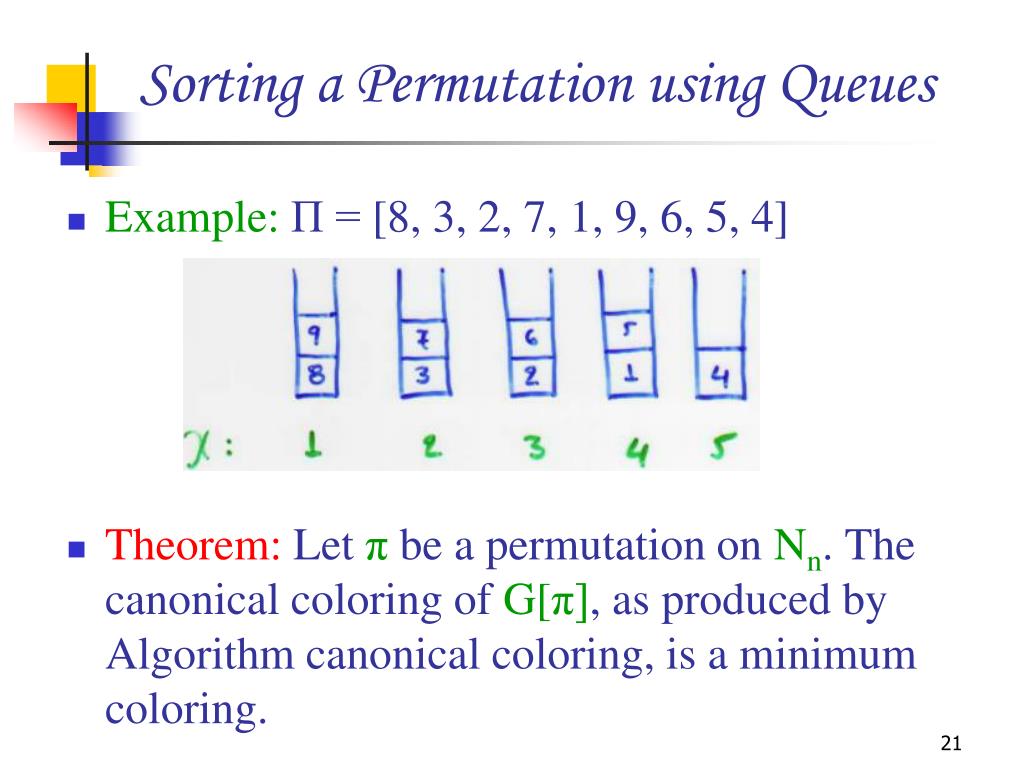 Sorting a Permutation using Queues • Example: Π =[8,3,2,7,1,9,6,5,4] • Theorem: Let πbe a permutation on Nn. The canonical coloring of G[π], as produced by Algorithm canonical coloring, is a minimum coloring.