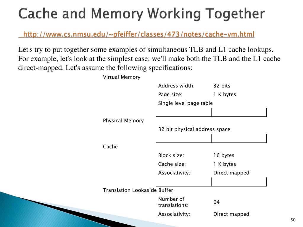 Cache and Memory Working Togetherhttp://www.cs.nmsu.edu/~pfeiffer/classes/473/notes/cache-vm.html Let's try to put together some examples of simultaneous TLB and L1 cache lookups. For example, let's look at the simplest case: we'll make both the TLB and the L1 cache direct-mapped. Let's assume the following specifications: