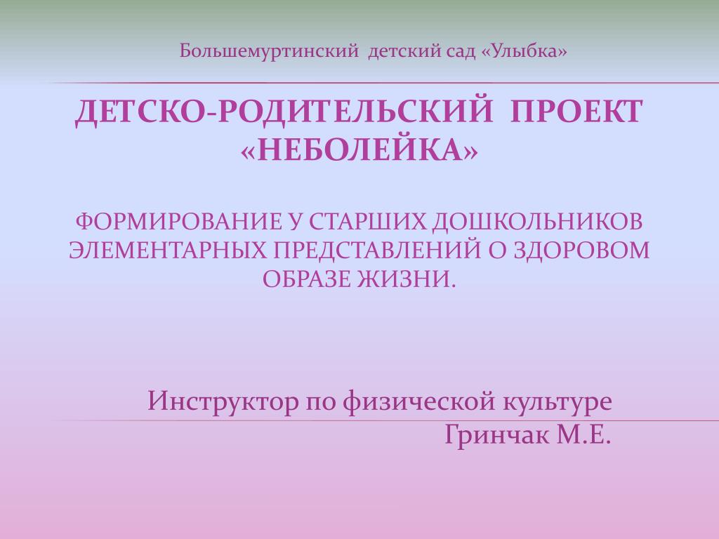 Большемуртинский детский сад «Улыбка» Инструктор по физической культуре Гринчак М.Е. ДЕТСКО-РОДИТЕЛЬСКИЙ ПРОЕКТ «НЕБОЛЕЙКА»Формирование у старших дошкольников элементарных представлений о здоровом образе жизни.