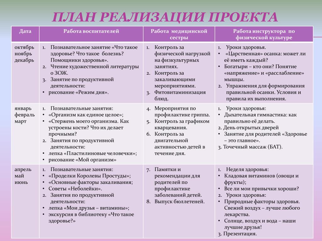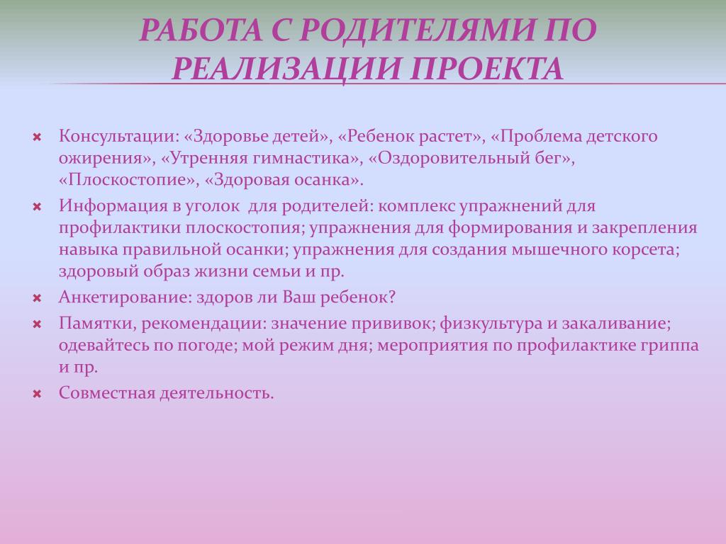 Консультации: «Здоровье детей», «Ребенок растет», «Проблема детского ожирения», «Утренняя гимнастика», «Оздоровительный бег», «Плоскостопие», «Здоровая осанка». • Информация в уголок для родителей: комплекс упражнений для профилактики плоскостопия; упражнения для формирования и закрепления навыка правильной осанки; упражнения для создания мышечного корсета; здоровый образ жизни семьи и пр. • Анкетирование: здоров ли Ваш ребенок? • Памятки, рекомендации: значение прививок; физкультура и закаливание; одевайтесь по погоде; мой режим дня; мероприятия по профилактике гриппа и пр. • Совместная деятельность. Работа с родителями по реализации проекта