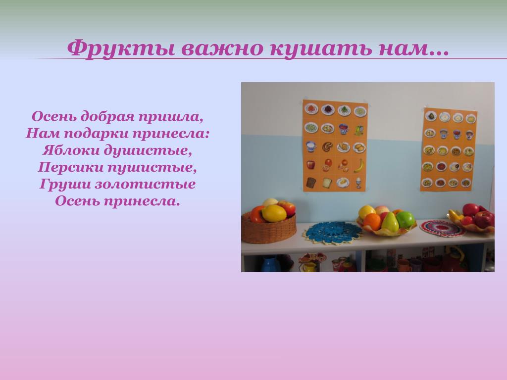 Фрукты важно кушать нам… Осень добрая пришла, Нам подарки принесла: Яблоки душистые, Персики пушистые, Груши золотистые Осень принесла.