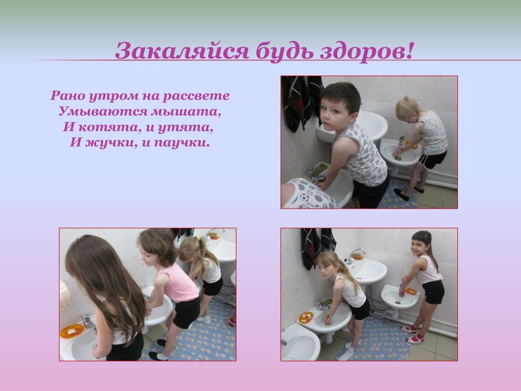 Закаляйся будь здоров! Рано утром на рассвете Умываются мышата, И котята, и утята, И жучки, и паучки.