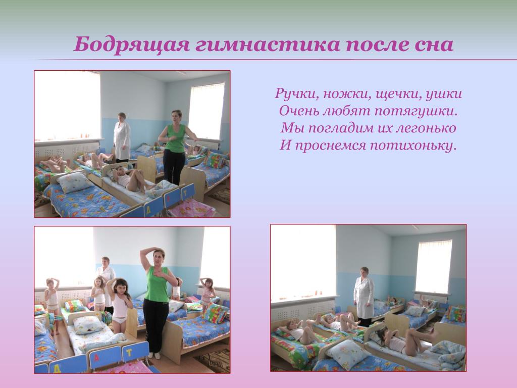 Бодрящая гимнастика после сна Ручки, ножки, щечки, ушки Очень любят потягушки. Мы погладим их легонько И проснемся потихоньку.