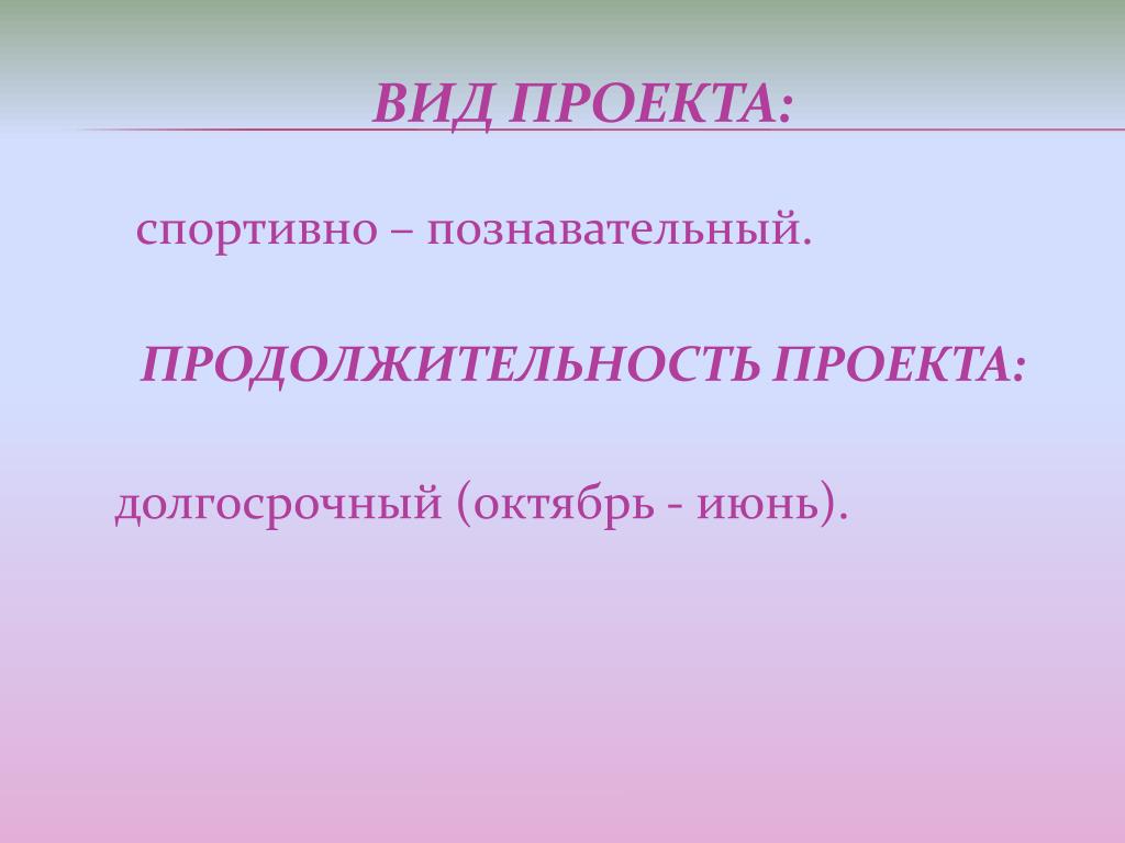 спортивно – познавательный. Вид проекта: Продолжительность проекта: долгосрочный (октябрь - июнь).
