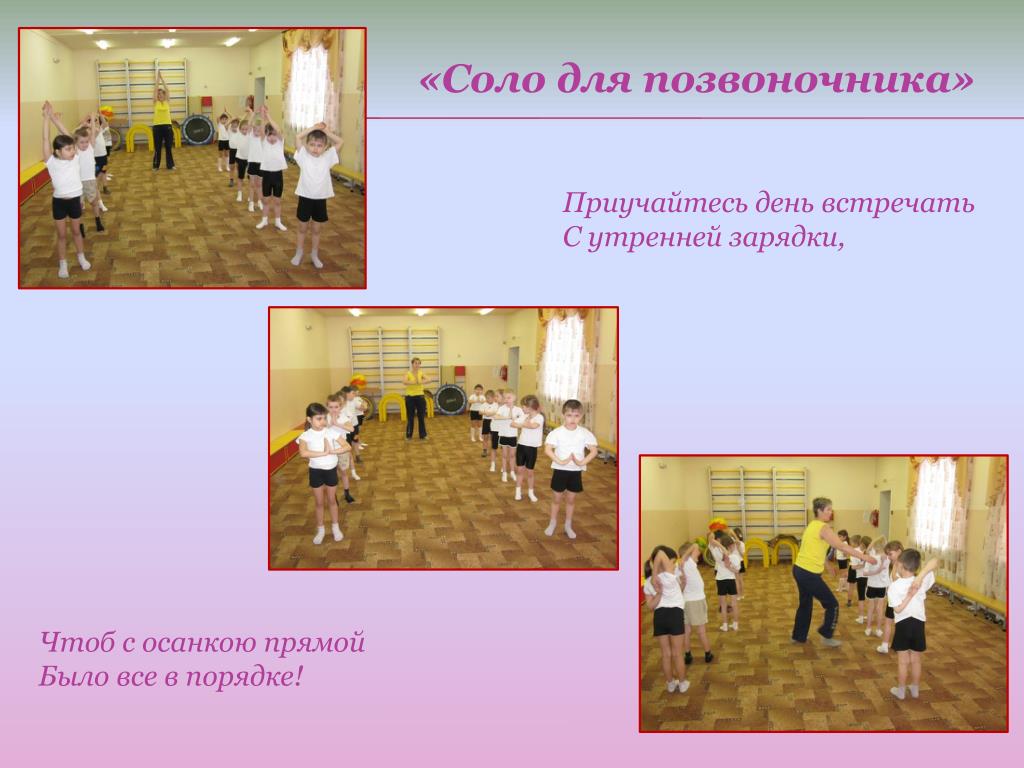 «Соло для позвоночника» Приучайтесь день встречать С утренней зарядки, Чтоб с осанкою прямой Было все в порядке!