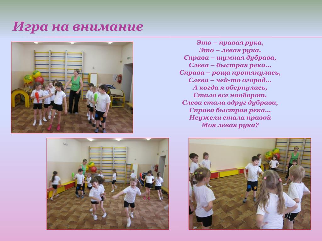Игра на внимание Это – правая рука, Это – левая рука. Справа – шумная дубрава, Слева – быстрая река… Справа – роща протянулась, Слева – чей-то огород... А когда я обернулась, Стало все наоборот. Слева стала вдруг дубрава, Справа быстрая река… Неужели стала правой Моя левая рука?