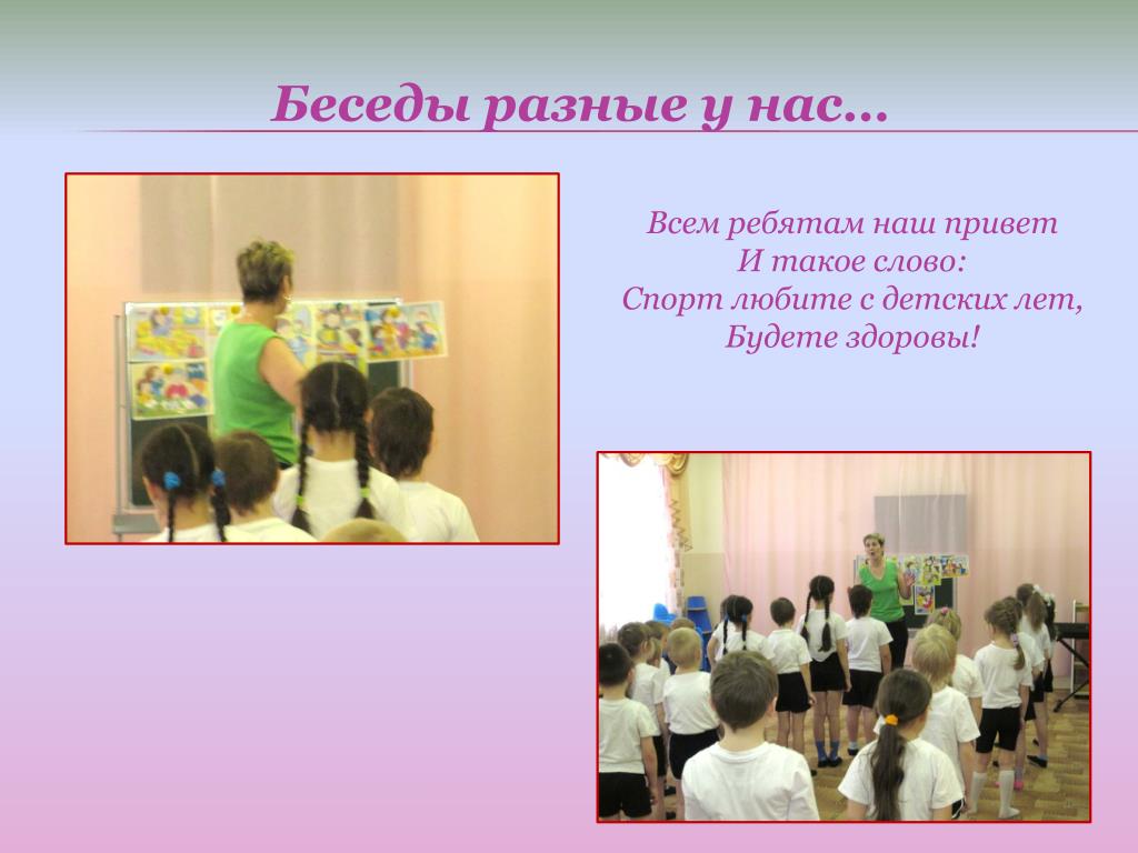 Беседы разные у нас… Всем ребятам наш привет И такое слово: Спорт любите с детских лет, Будете здоровы!