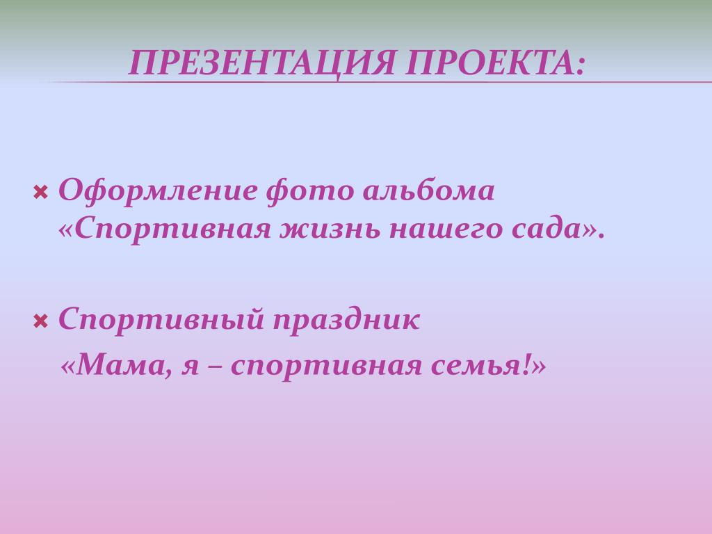 Оформление фото альбома «Спортивная жизнь нашего сада». • Спортивный праздник «Мама, я – спортивная семья!» ПРЕЗЕНТАЦИЯ ПРОЕКТА: