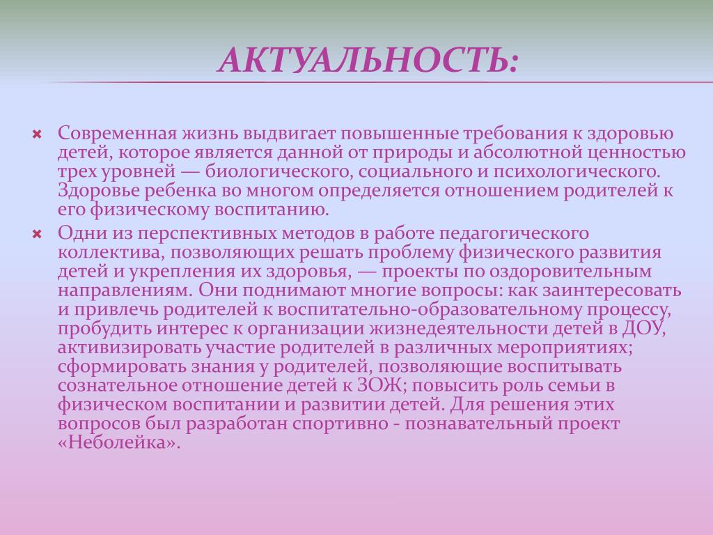 Современная жизнь выдвигает повышенные требования к здоровью детей, которое является данной от природы и абсолютной ценностью трех уровней — биологического, социального и психологического. Здоровье ребенка во многом определяется отношением родителей к его физическому воспитанию. Одни из перспективных методов в работе педагогического коллектива, позволяющих решать проблему физического развития детей и укрепления их здоровья, — проекты по оздоровительным направлениям. Они поднимают многие вопросы: как заинтересовать и привлечь родителей к воспитательно-образовательному процессу, пробудить интерес к организации жизнедеятельности детей в ДОУ, активизировать участие родителей в различных мероприятиях; сформировать знания у родителей, позволяющие воспитывать сознательное отношение детей к ЗОЖ; повысить роль семьи в физическом воспитании и развитии детей. Для решения этих вопросов был разработан спортивно - познавательный проект «Неболейка». Актуальность: