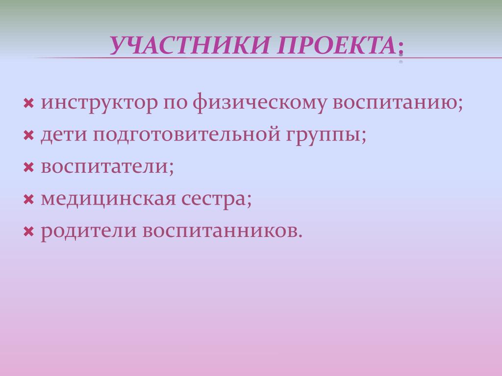инструктор по физическому воспитанию; дети подготовительной группы; воспитатели; медицинская сестра; родители воспитанников. Участникипроекта: