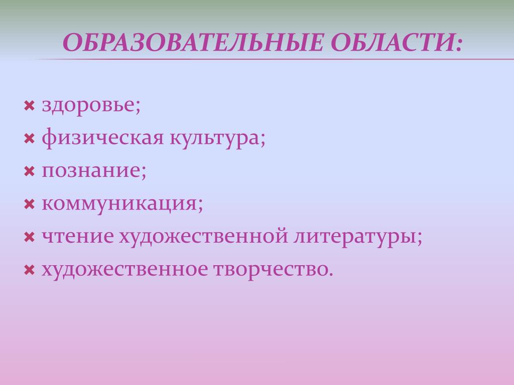 здоровье; физическая культура; познание; коммуникация; чтение художественной литературы; художественное творчество. Образовательные области:
