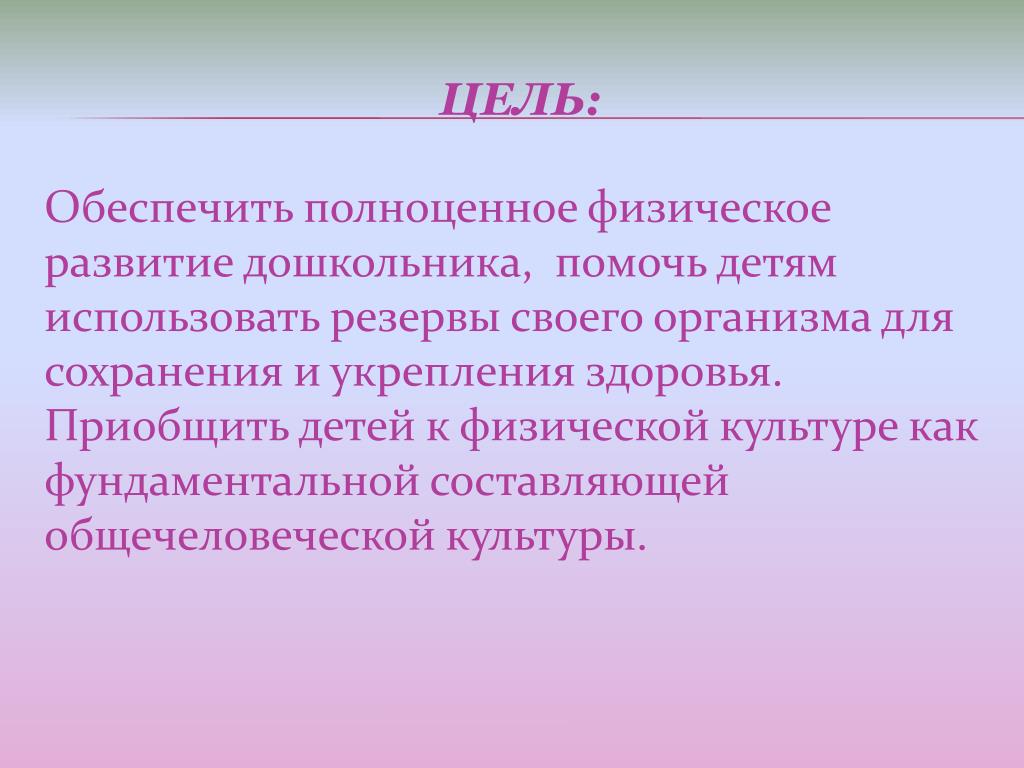 Обеспечить полноценное физическое развитие дошкольника, помочь детям использовать резервы своего организма для сохранения и укрепления здоровья. Приобщить детей к физической культуре как фундаментальной составляющей общечеловеческой культуры. Цель: