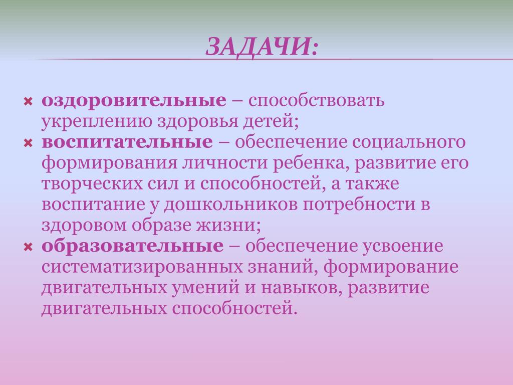 оздоровительные – способствовать укреплению здоровья детей; воспитательные – обеспечение социального формирования личности ребенка, развитие его творческих сил и способностей, а также воспитание у дошкольников потребности в здоровом образе жизни; образовательные – обеспечение усвоение систематизированных знаний, формирование двигательных умений и навыков, развитие двигательных способностей. Задачи: