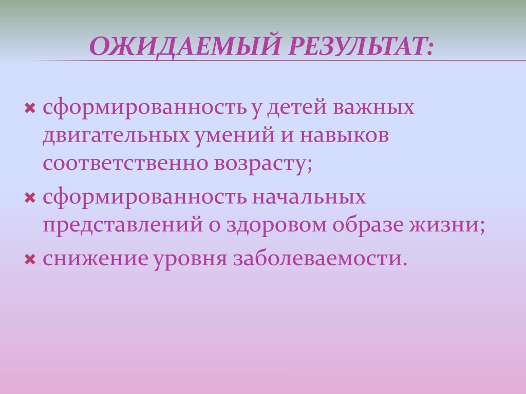 сформированность у детей важных двигательных умений и навыков соответственно возрасту; • сформированность начальных представлений о здоровом образе жизни; • снижение уровня заболеваемости. Ожидаемый результат:
