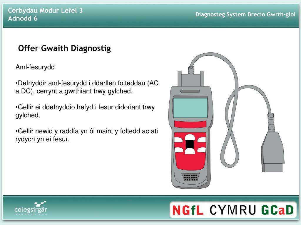 Cerbydau Modur Lefel 3Adnodd 6 Diagnosteg System Brecio Gwrth-gloi Offer Gwaith Diagnostig Aml-fesurydd • Defnyddir aml-fesurydd i ddarllen folteddau (AC a DC), cerrynt a gwrthiant trwy gylched. • Gellir ei ddefnyddio hefyd i fesur didoriant trwy gylched. • Gellir newid y raddfa yn ôl maint y foltedd ac ati rydych yn ei fesur.
