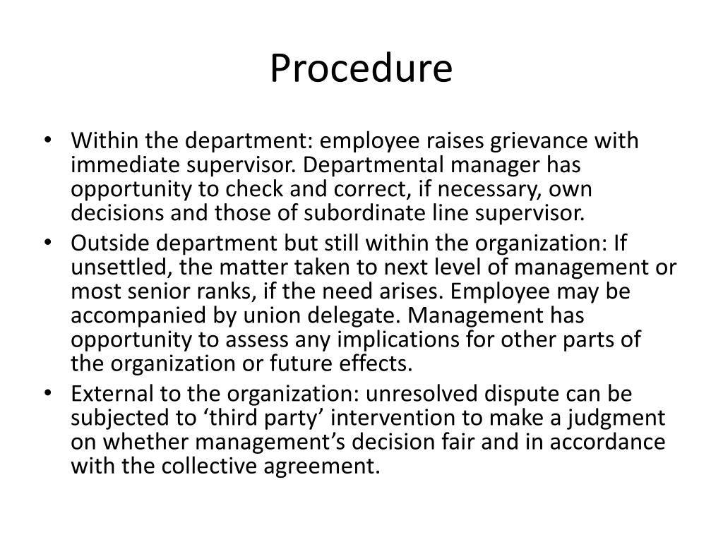 Procedure • Within the department: employee raises grievance with immediate supervisor. Departmental manager has opportunity to check and correct, if necessary, own decisions and those of subordinate line supervisor. • Outside department but still within the organization: If unsettled, the matter taken to next level of management or most senior ranks, if the need arises. Employee may be accompanied by union delegate. Management has opportunity to assess any implications for other parts of the organization or future effects. • External to the organization: unresolved dispute can be subjected to ‘third party’ intervention to make a judgment on whether management’s decision fair and in accordance with the collective agreement.