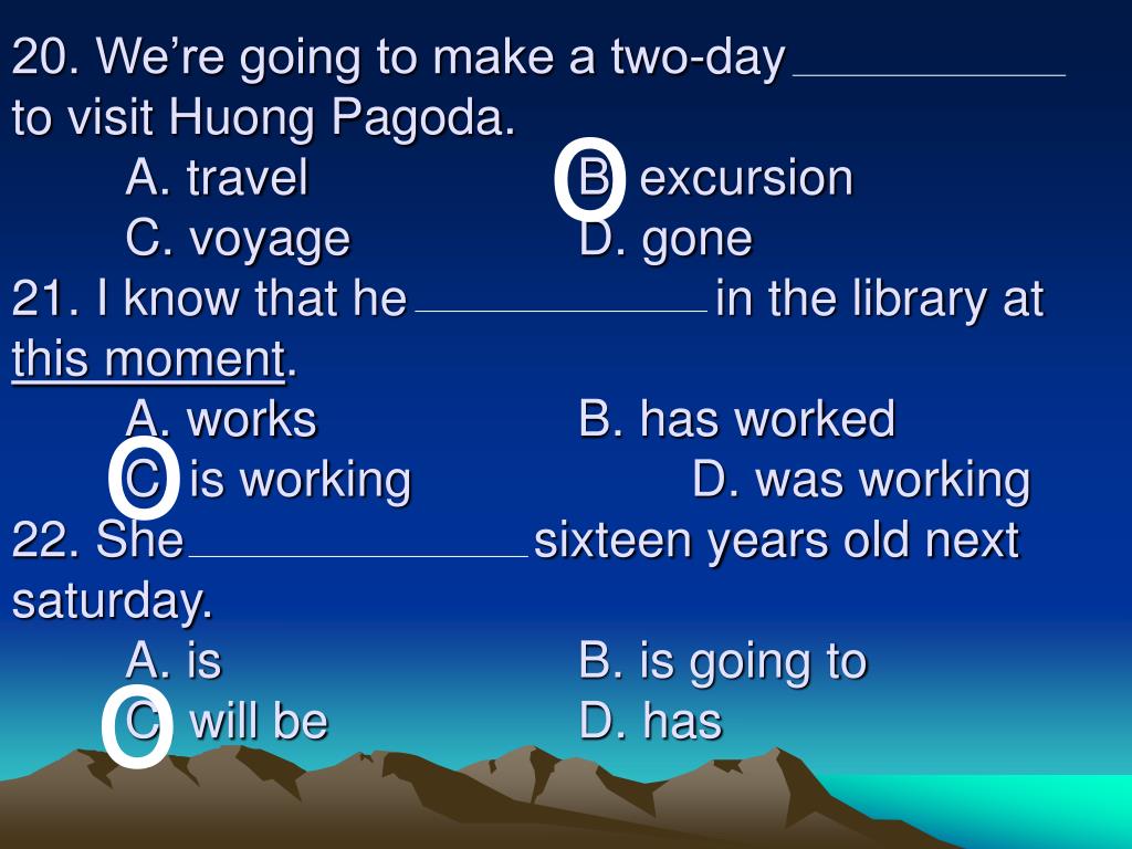 20. We’re going to make a two-day to visit Huong Pagoda. A. travel B. excursion C. voyage D. gone21. I know that he in the library at this moment. A. works B. has worked C. is working D. was working22. She sixteen years old next saturday. A. is B. is going to C. will be D. has o o o