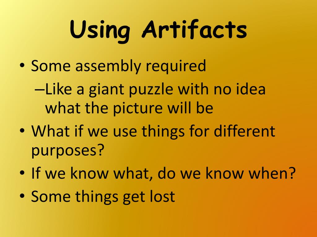 Using Artifacts • Some assembly required • Like a giant puzzle with no idea what the picture will be • What if we use things for different purposes? • If we know what, do we know when? • Some things get lost