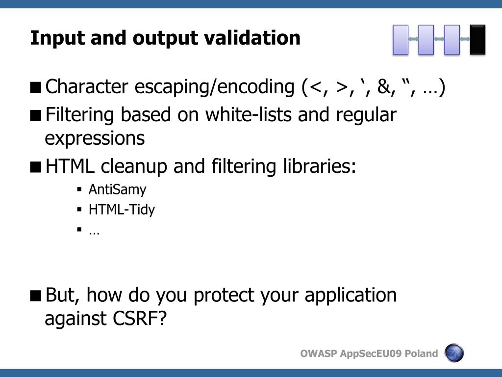 Input and output validation • Character escaping/encoding (<, >, ‘, &, “, …) • Filtering based on white-lists and regular expressions • HTML cleanup and filtering libraries: • AntiSamy • HTML-Tidy • … • But, how do you protect your application against CSRF?